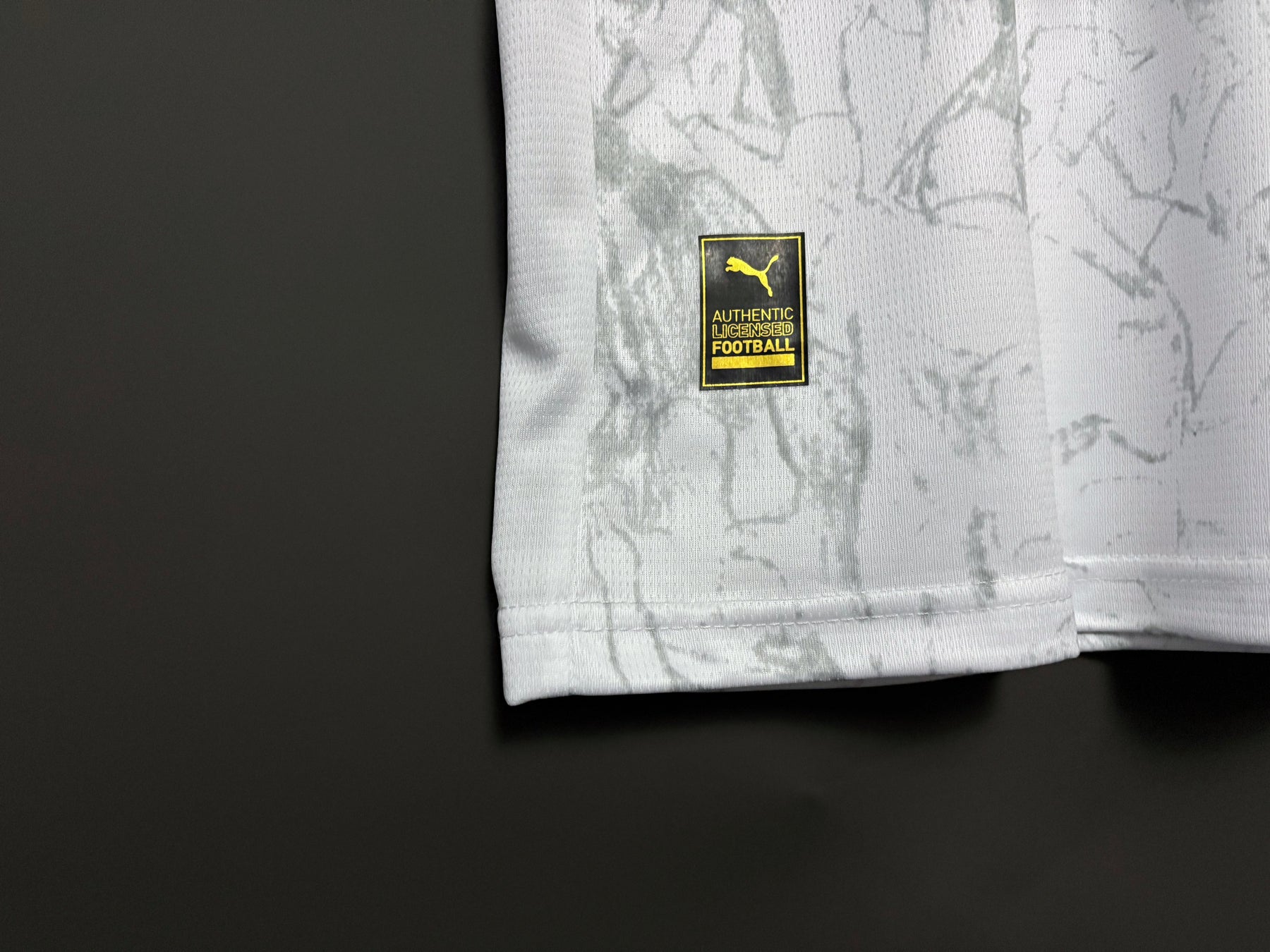 Detta är den officiella Puma x KidSuper-tröjan för Manchester City under FIFA Club World Cup 2025. Tröjan har en vit bas med ett iögonfallande diagonalt band i rött och svart, inspirerat av klassiska fotbollsdesigner men med en modern och konstnärlig twist från KidSuper. Det subtila mönstret över hela tyget ger en unik och exklusiv look. Tröjan är tillverkad i lätt och andningsbart material som ger hög komfort både under match och till vardags.