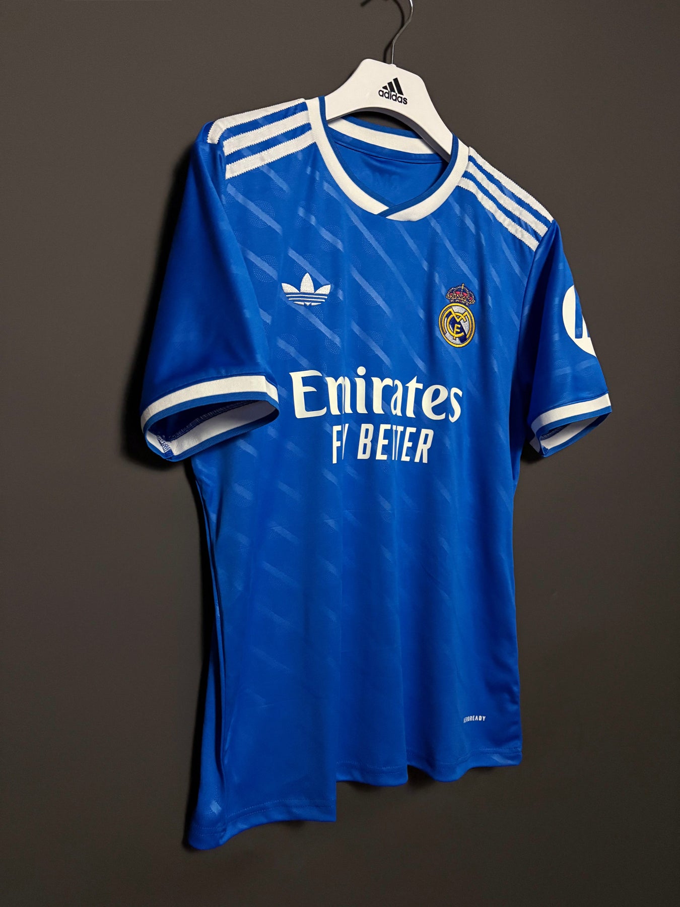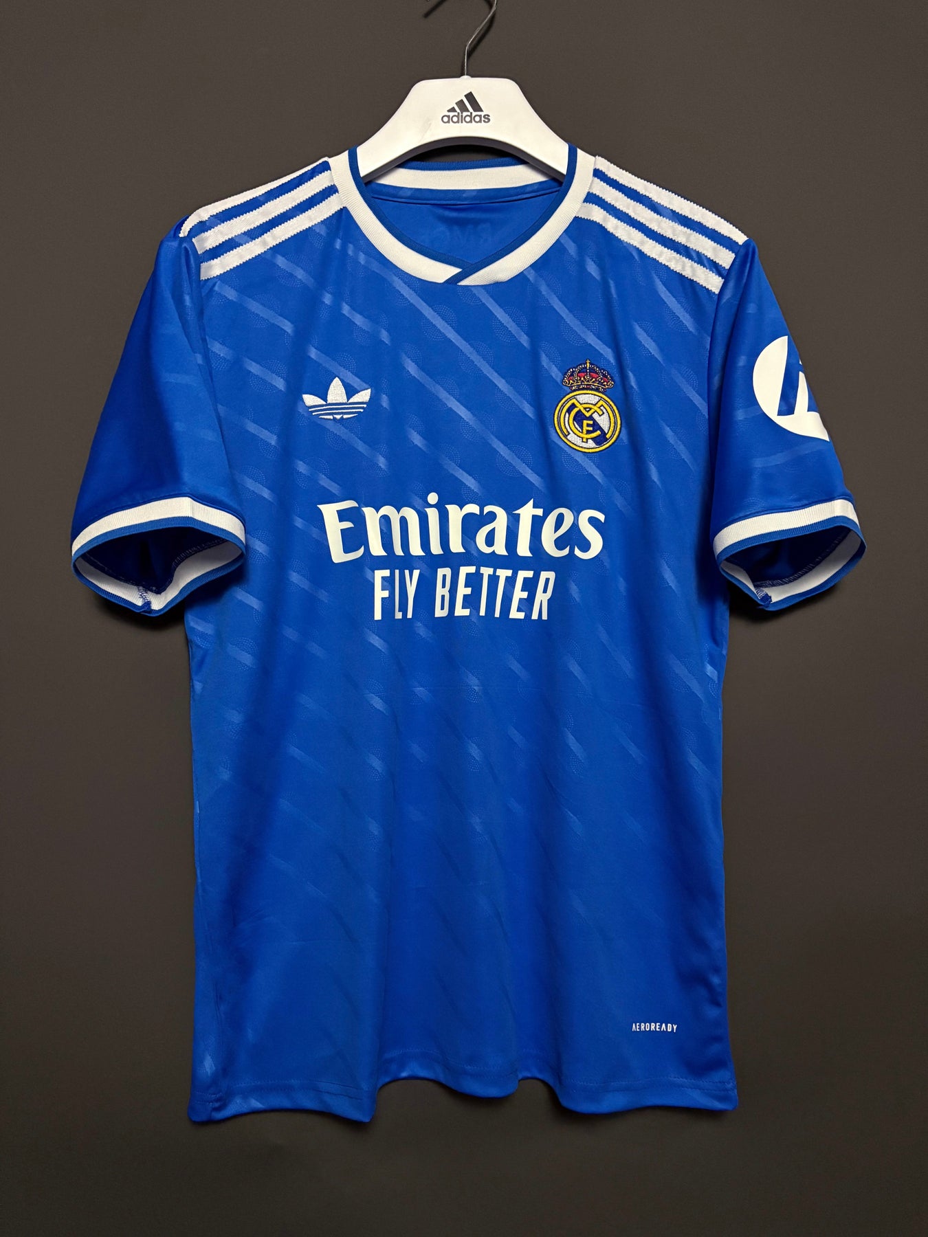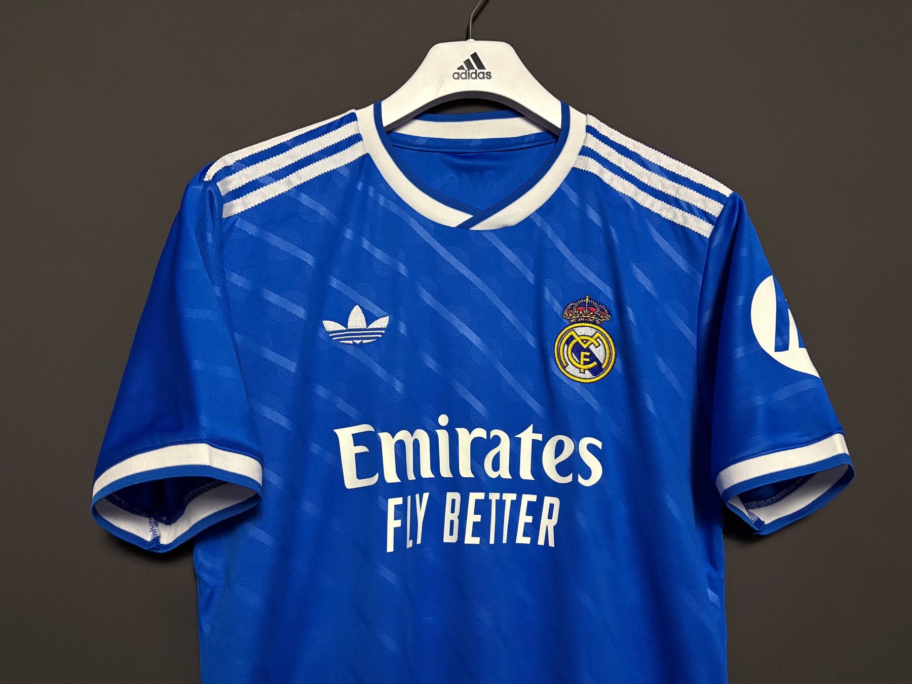Real Madrids tredjetröja har en djupblå färg med subtila mönster som ger en modern och stilren look. De vita detaljerna och klubbmärket skapar en stark kontrast som framhäver tröjans elegans. Tröjan är tillverkad i lätt och andningsbart material som ger hög komfort både på planen och till vardags.