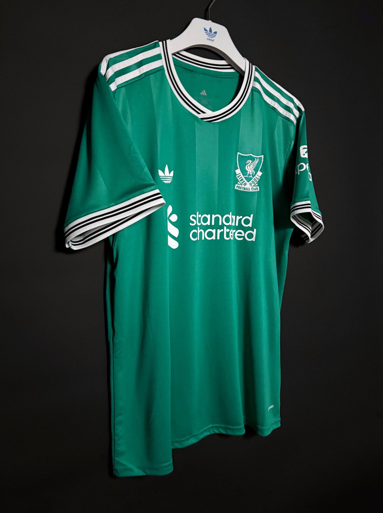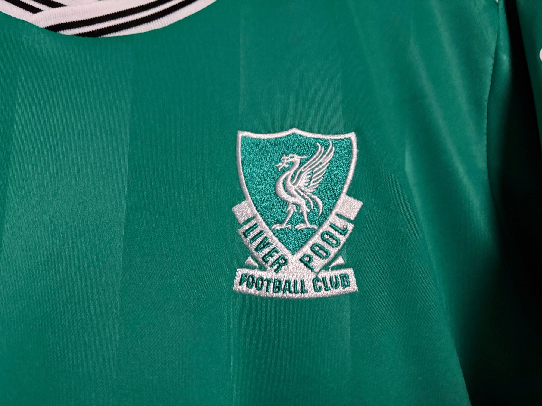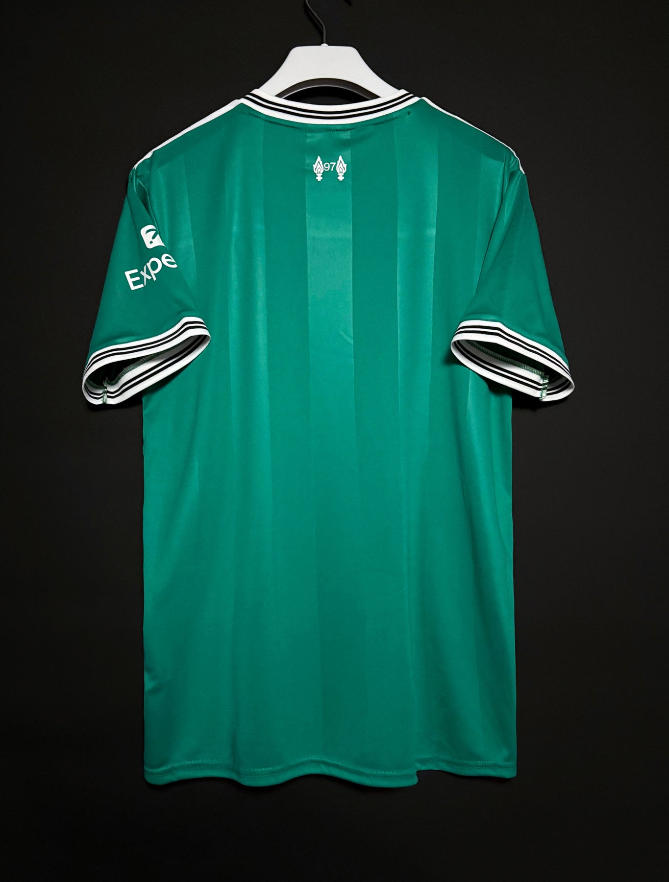 Liverpools tredjetröja har en djup grön färg med subtila vertikala ränder som ger en elegant och modern look. De vita detaljerna på krage och ärmar skapar en snygg kontrast och förstärker tröjans klassiska känsla. Tröjan är tillverkad i lätt och andningsbart material som ger hög komfort både under match och till vardags.